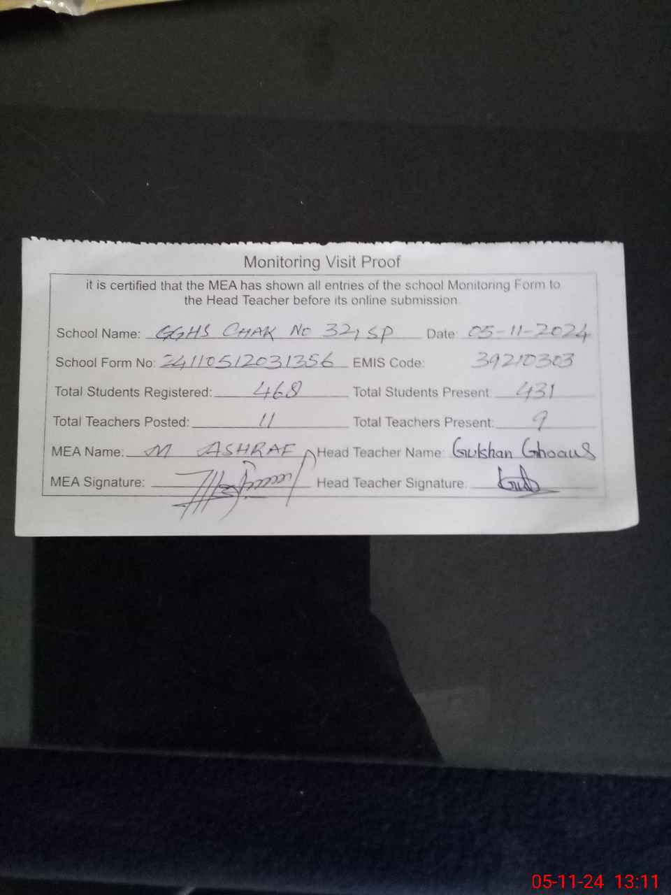 | EMIS Code: 39210303 | Name of School: GGHS CHAK NO.32 SP TABAR | |||