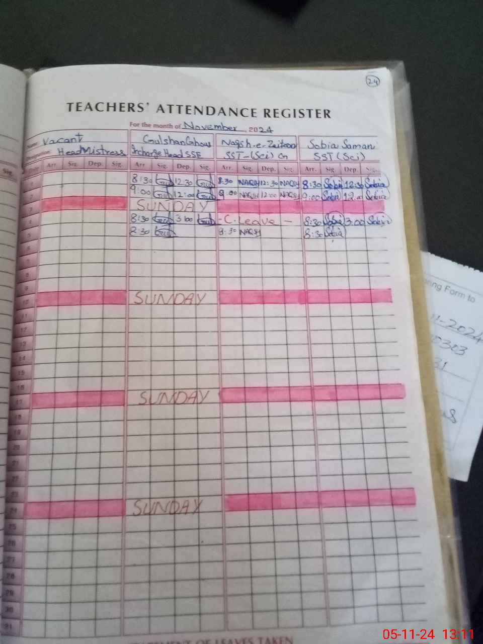 | No. of Students Present - Female | 25 | 0 | 37 | 35 | 43 | 35 | 44 | 44 | 39 | 52 | 54 | 23 | 0 | 431 | ||