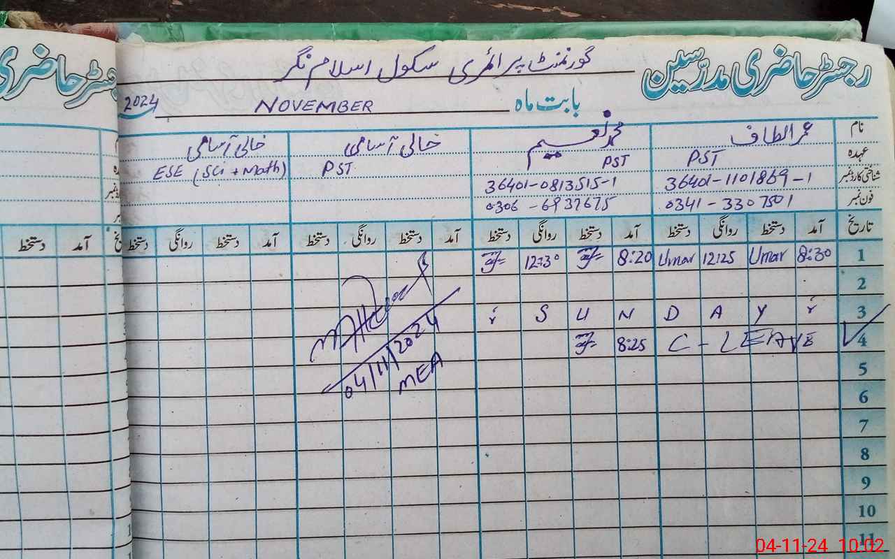 | Name: UM**** AL**** Designation: (School Headmaster's/Headmistress's) PST Phone/Cell Number: 03**** |