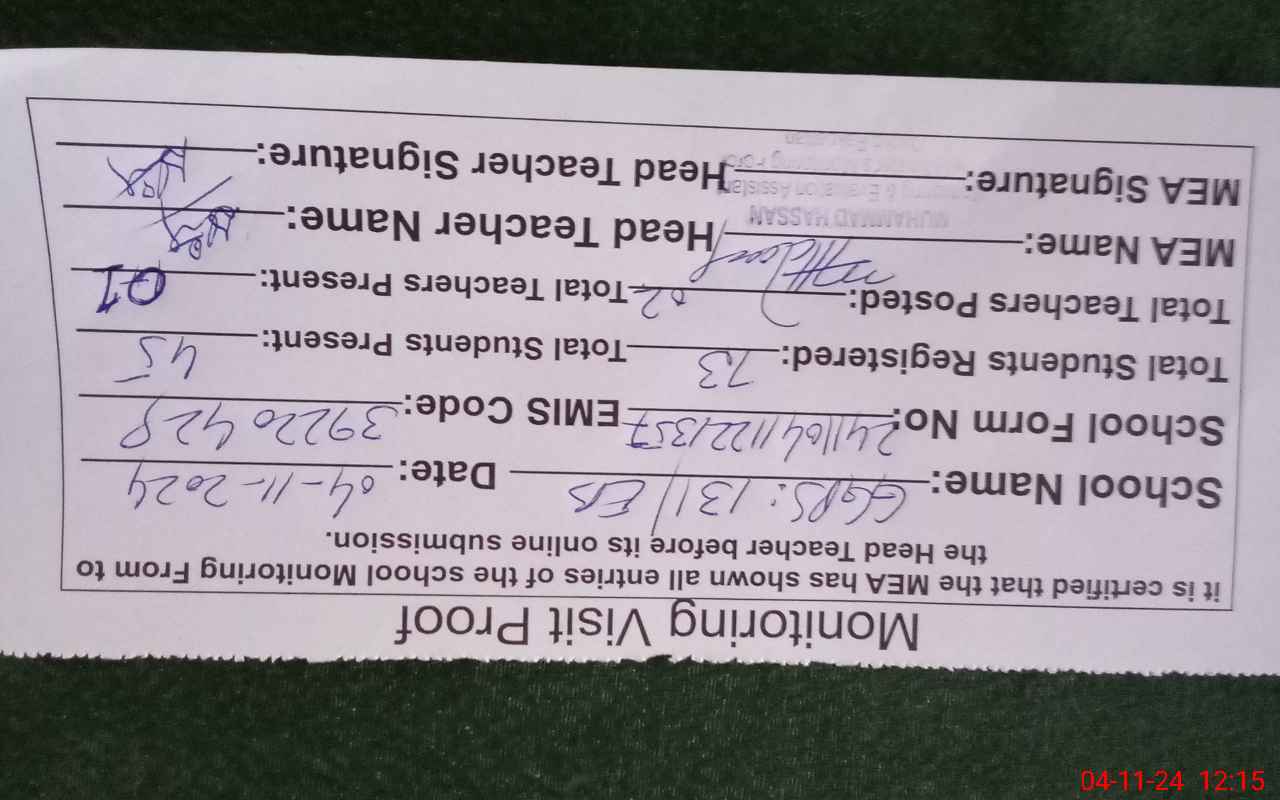 | Attendance Register | Head Teacher | MEA with School | Visit Proof |