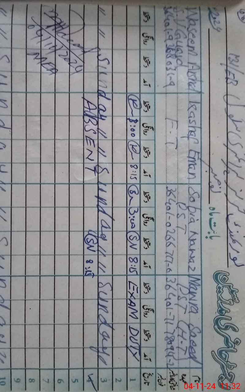 | CNIC | Full Name | Designation | R/C | Absence During Last Calender Month |
