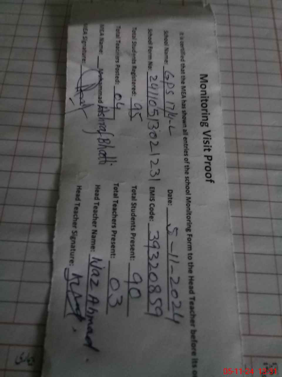 | Attendance Register | Head Teacher | MEA with School | Visit Proof |