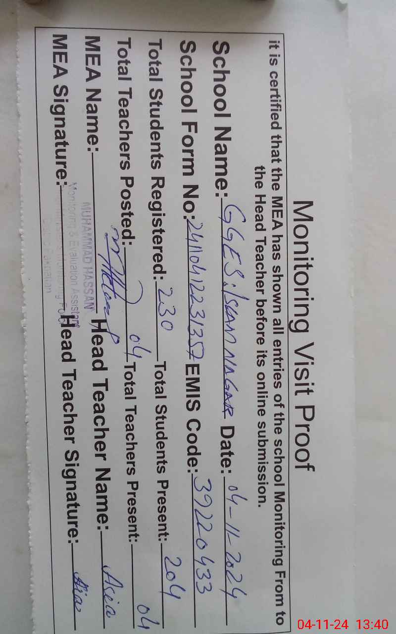 | EMIS Code: 39220433 | Name of School: GGES ISLAM NAGAR NO 1 | |||