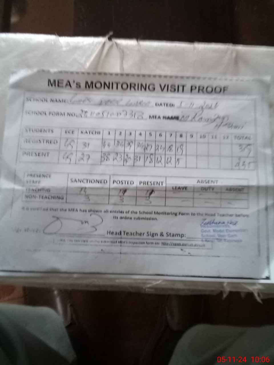 | Attendance Register | Head Teacher | MEA with School | Visit Proof |