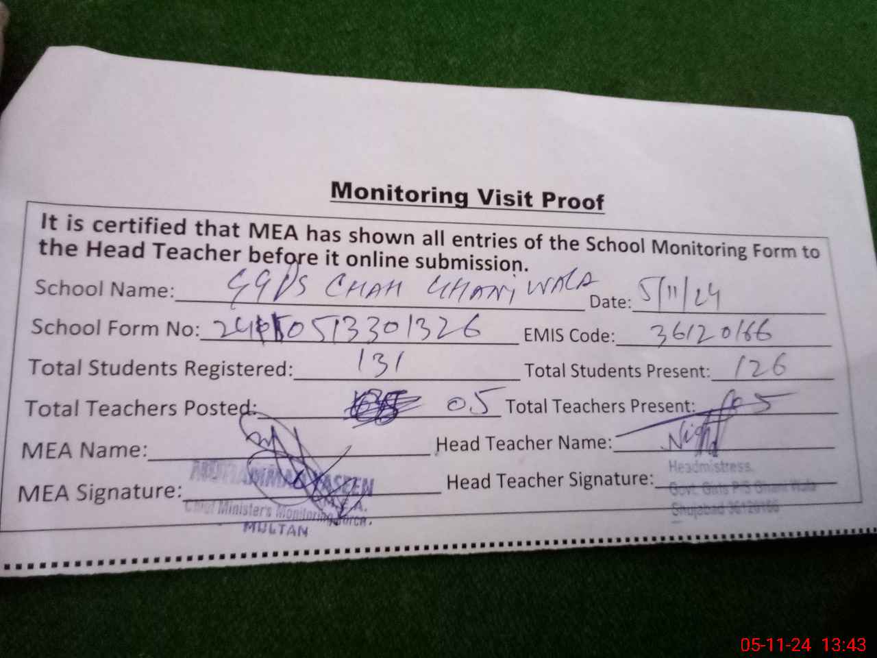 | Attendance Register | Head Teacher | MEA with School | Visit Proof |