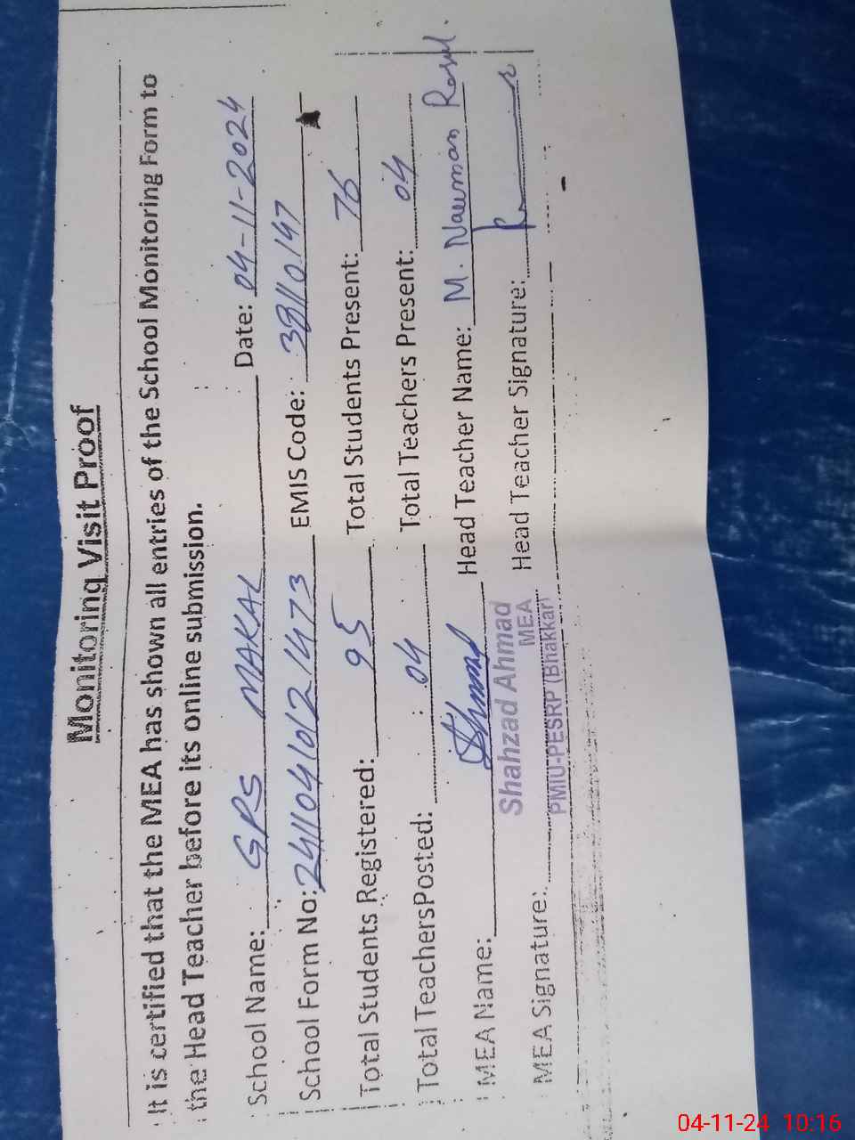 | Attendance Register | Head Teacher | MEA with School | Visit Proof |