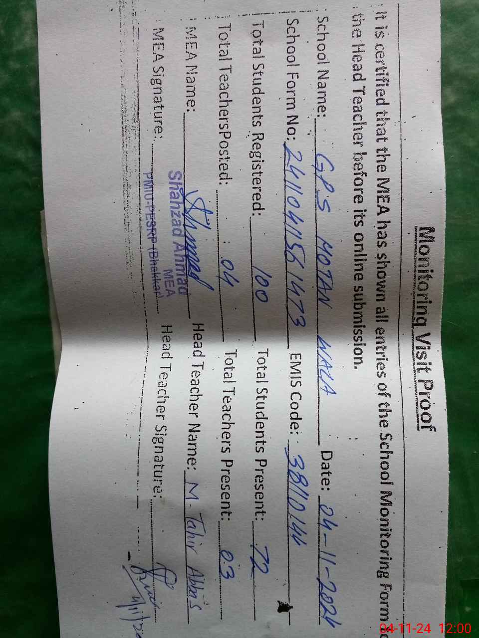| Attendance Register | Head Teacher | MEA with School | Visit Proof |