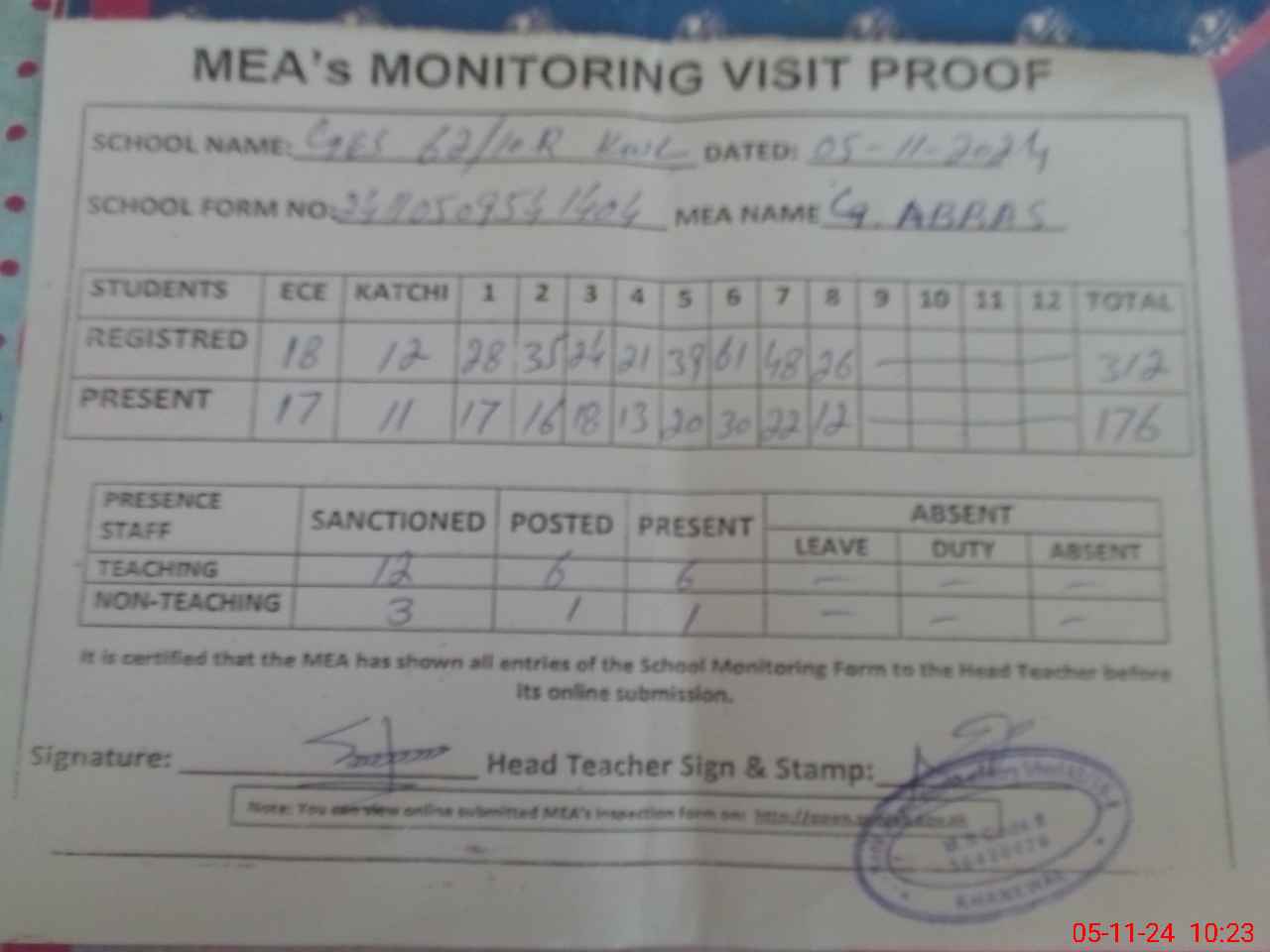 | Attendance Register | Head Teacher | MEA with School | Visit Proof |