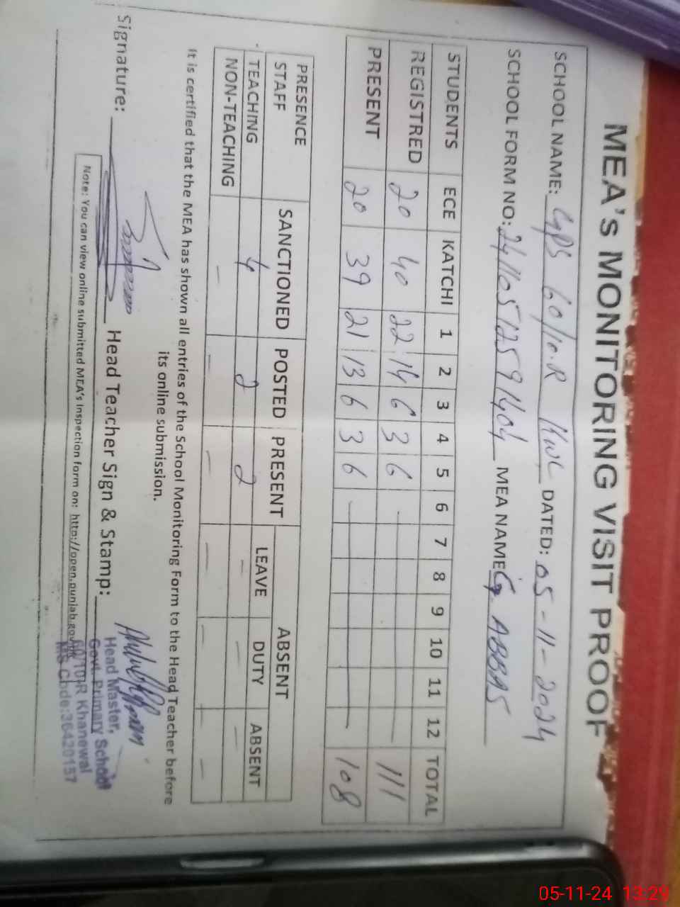 | Attendance Register | Head Teacher | MEA with School | Visit Proof |