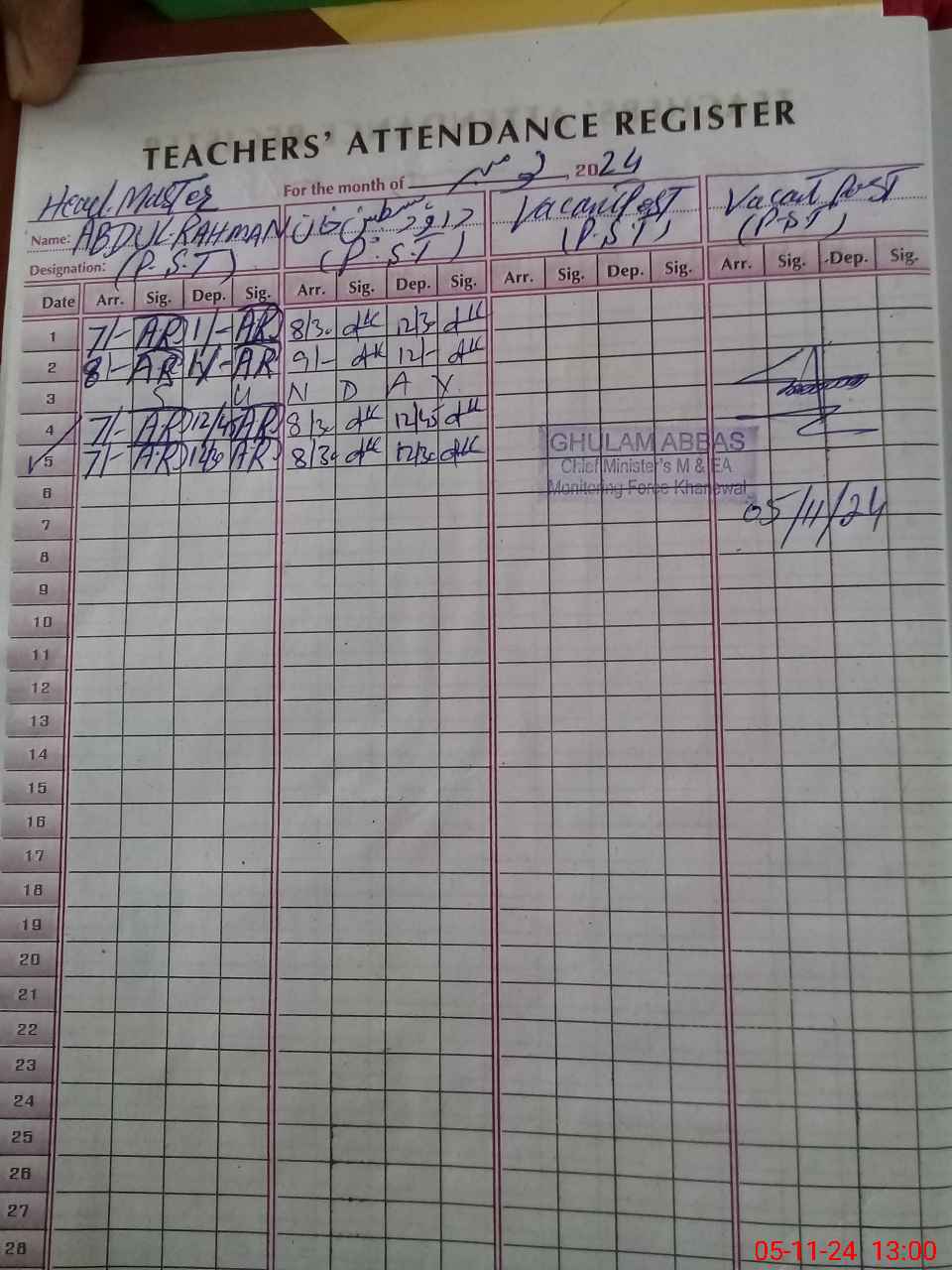| CNIC | Full Name | Designation | R/C | Absence During Last Calender Month |