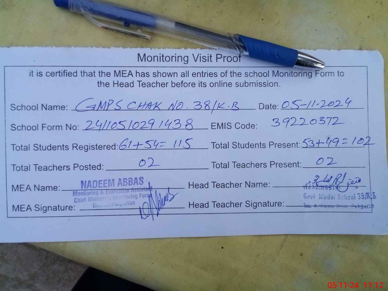 | EMIS Code: 39220372 | Name of School: GMPS CHAK NO 38 KB | |||