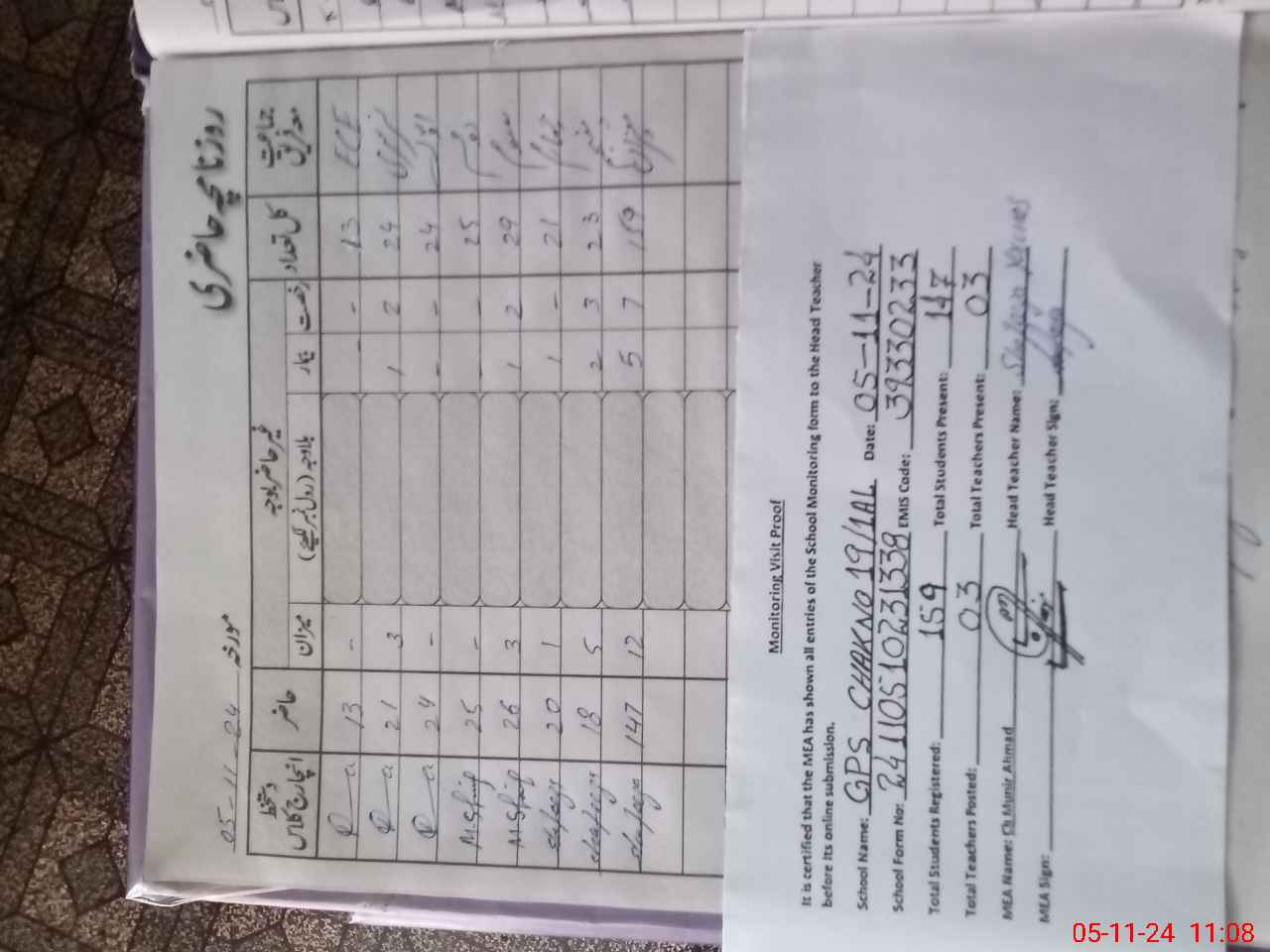 | Attendance Register | Head Teacher | MEA with School | Visit Proof |