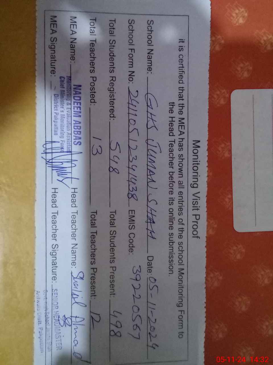 | Attendance Register | Head Teacher | MEA with School | Visit Proof |
