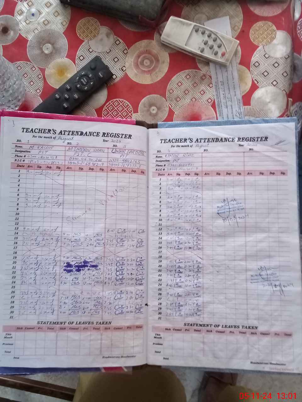 | CNIC | Full Name | Designation | R/C | Absence during last cal. month |