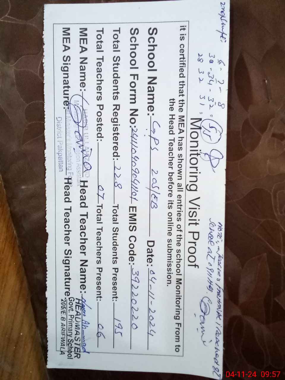 | Attendance Register | Head Teacher | MEA with School | Visit Proof |