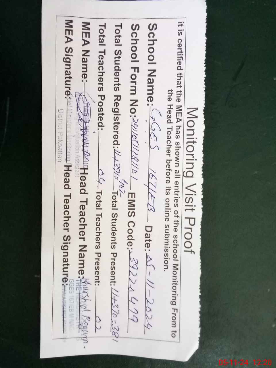 | EMIS Code: 39220499 | Name of School: GGES CHAK NO.167 EB | |||