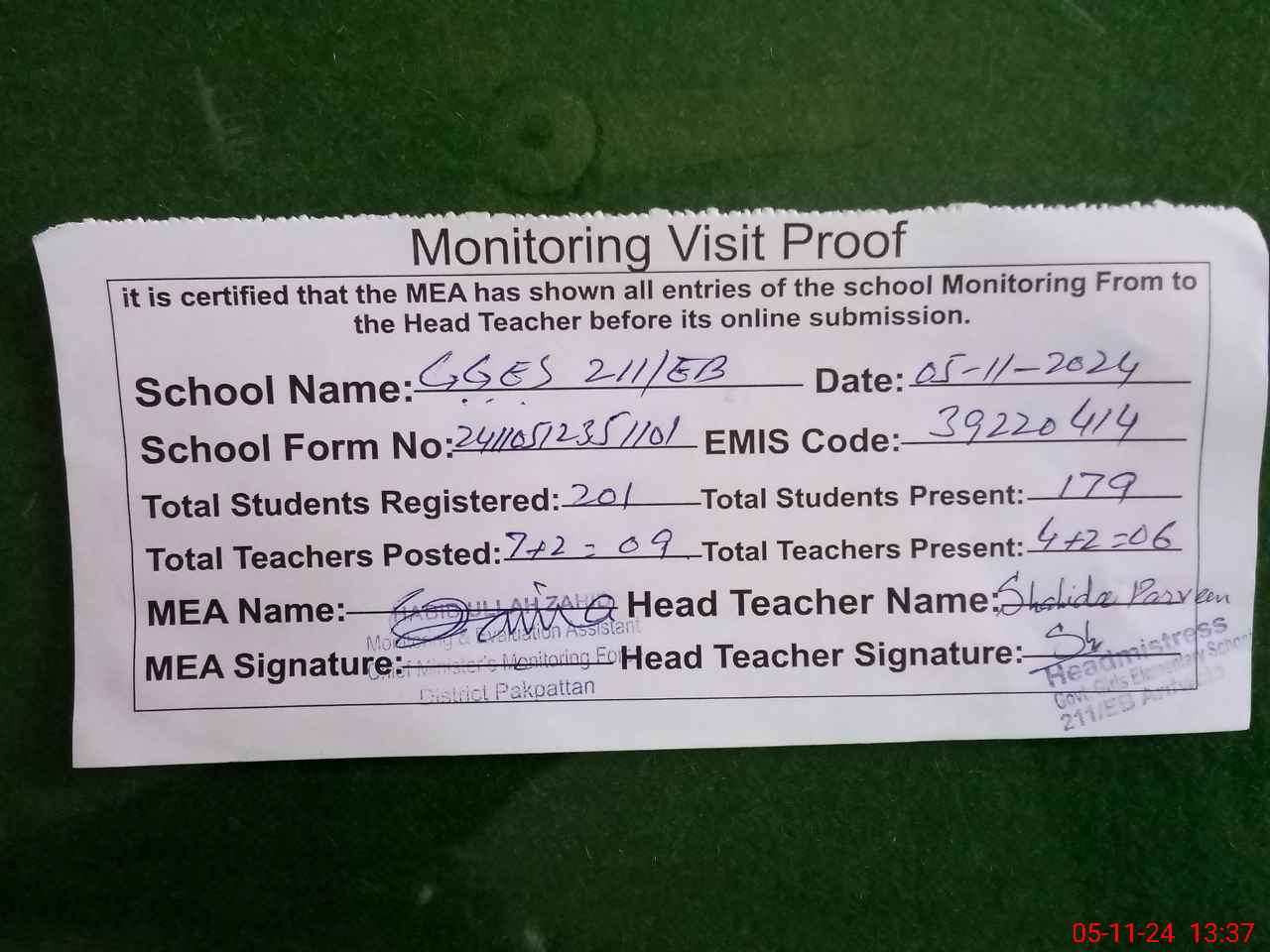 | Attendance Register | Head Teacher | MEA with School | Visit Proof |