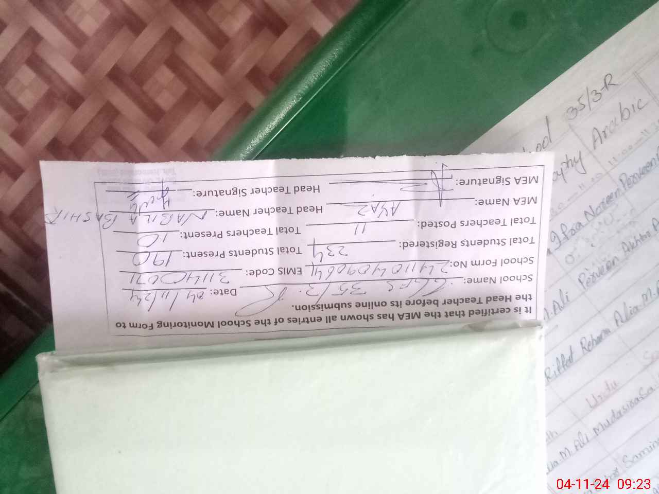 | Attendance Register | Head Teacher | MEA with School | Visit Proof |