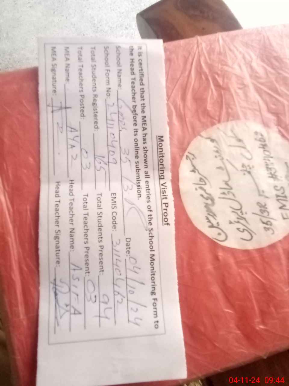 | Attendance Register | Head Teacher | MEA with School | Visit Proof |