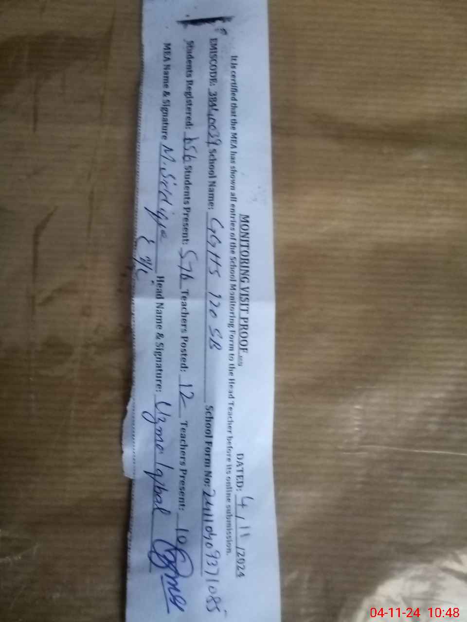 | Monitoring Date: 04-11-2024 | Start Time: 04-11-2024 09:37 AM | End Time: 04-11-2024 10:53 AM | Name of MEA: MU**** SI**** | |