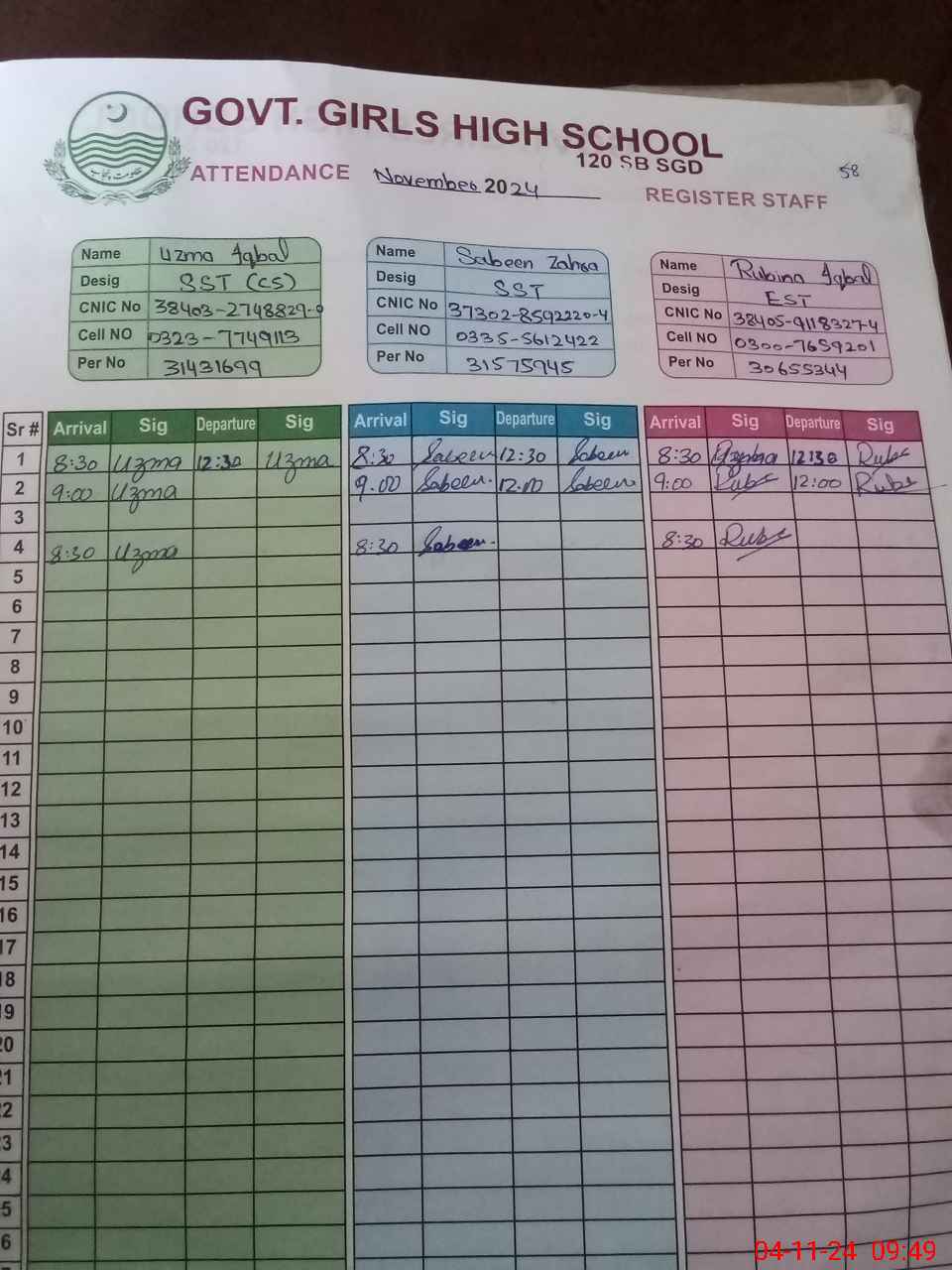 | CNIC | Full Name | Designation | R/C | Absence During Last Calender Month |