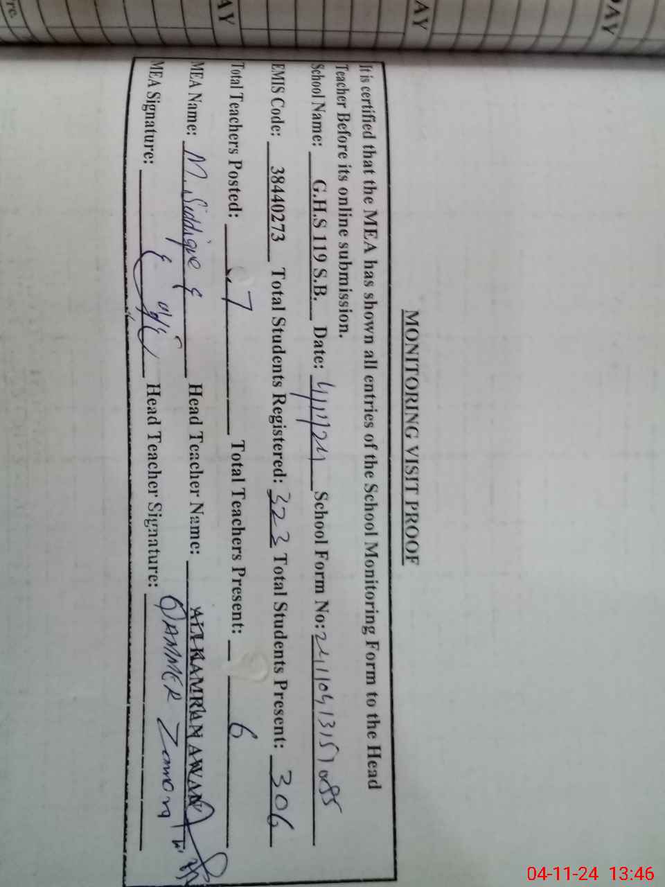 | Attendance Register | Head Teacher | MEA with School | Visit Proof |