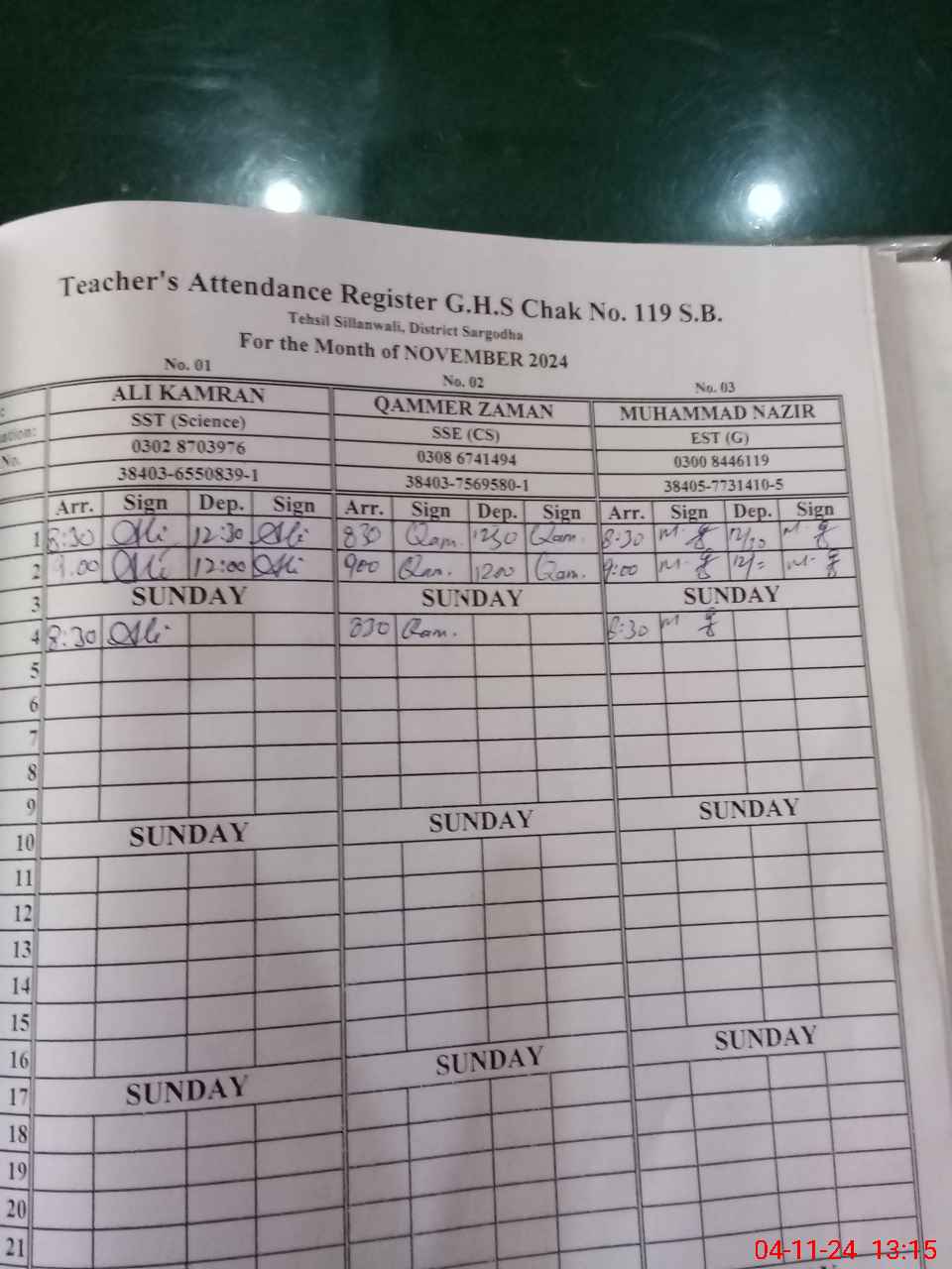 | CNIC | Full Name | Designation | R/C | Absence During Last Calender Month |