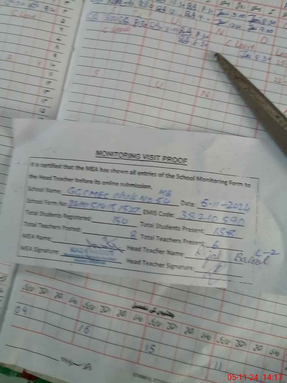 | Attendance Register | Head Teacher | MEA with School | Visit Proof |