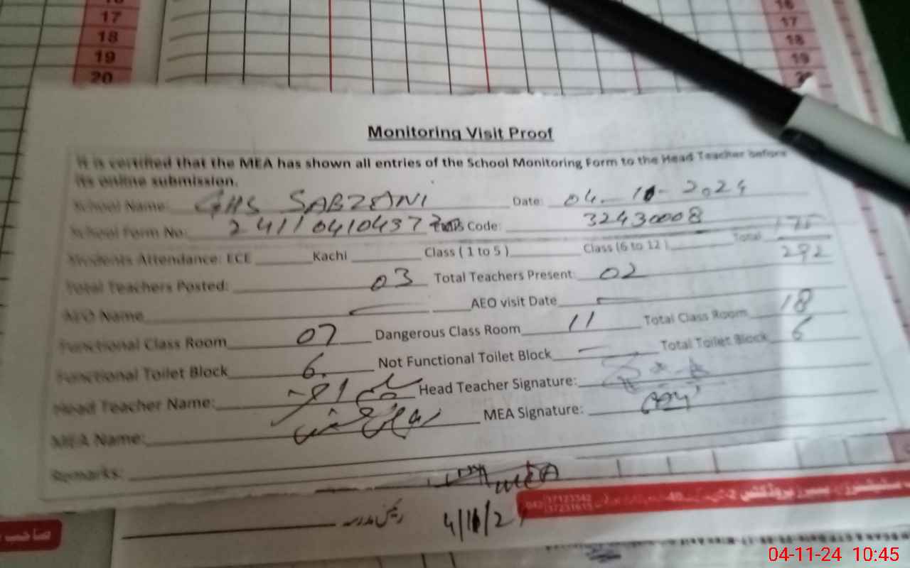 | EMIS Code: 32430008 | Name of School: GHS SABZANI | |||