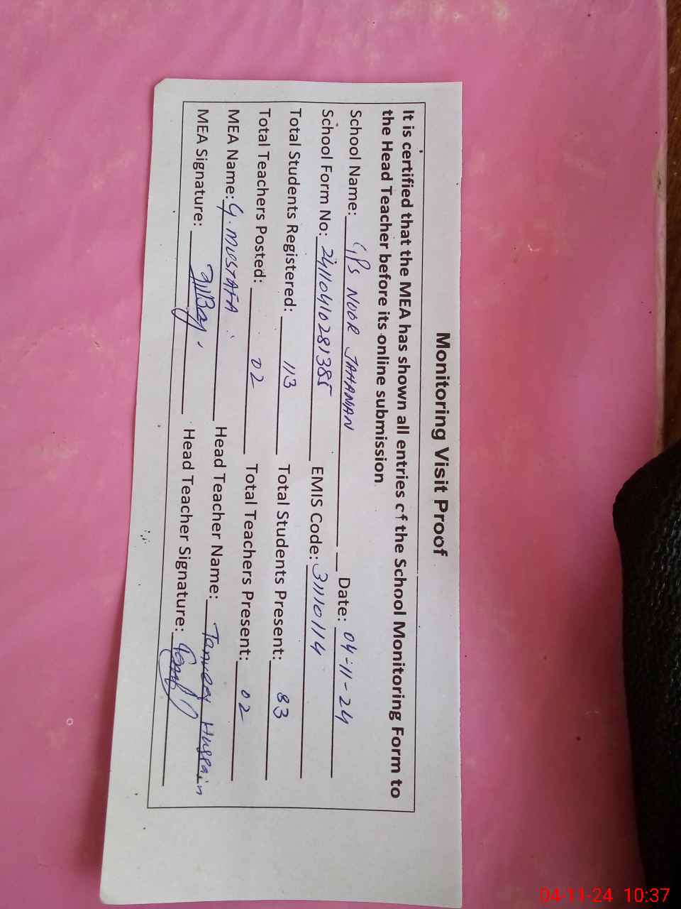| EMIS Code: 31110114 | Name of School: GPS NOOR JAHANIAN | |||