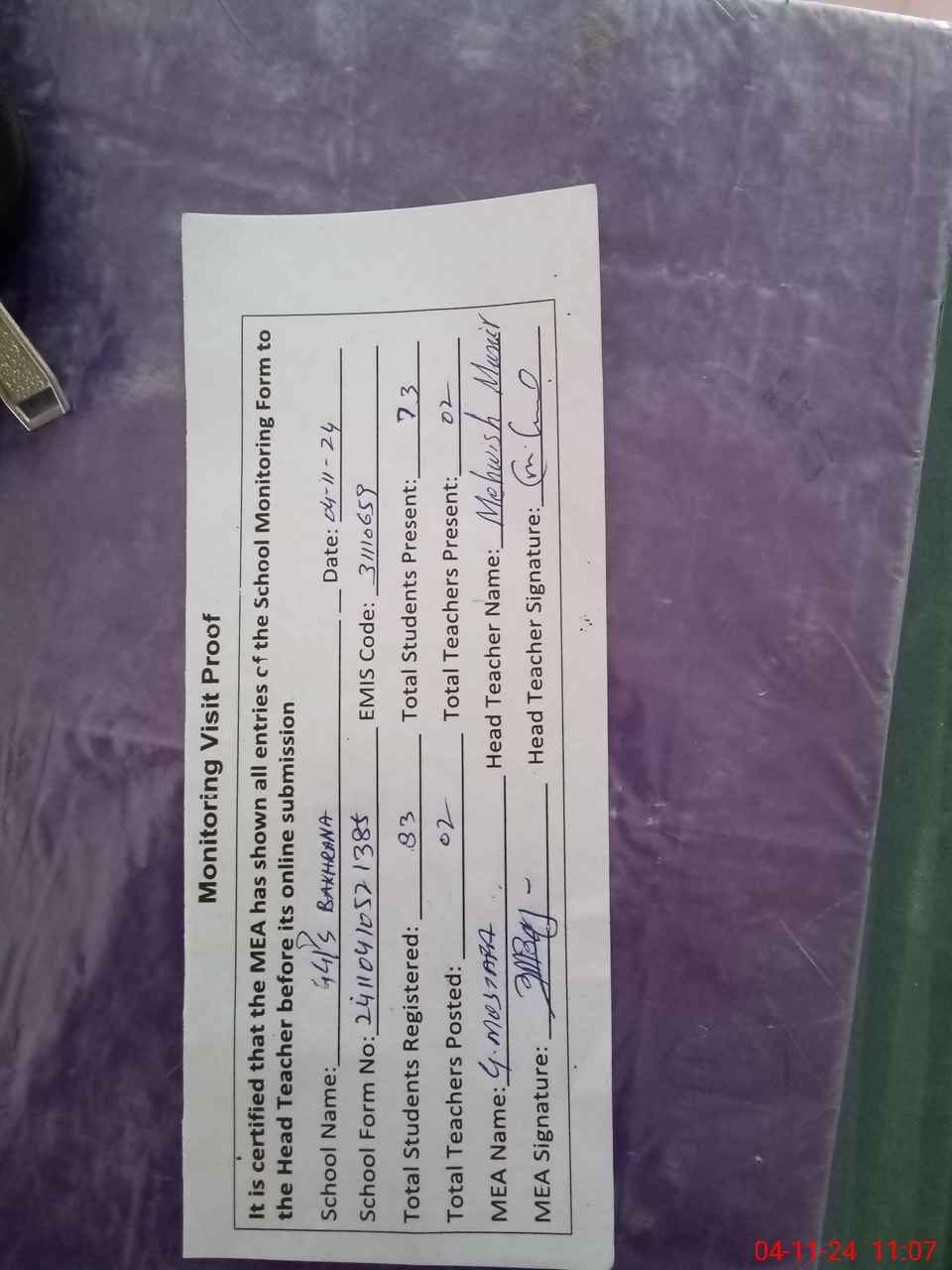 | Attendance Register | Head Teacher | MEA with School | Visit Proof |