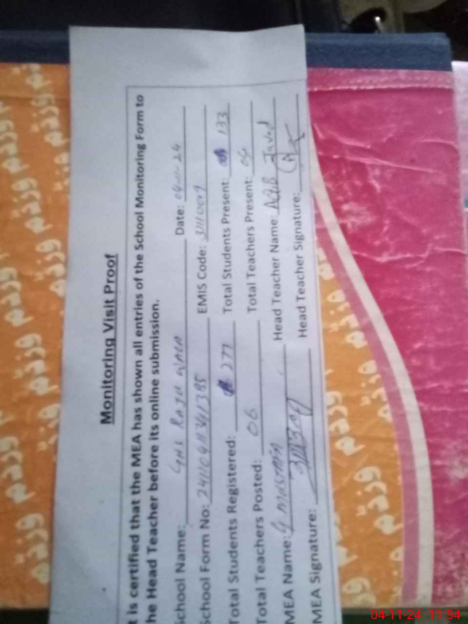 | Attendance Register | Head Teacher | MEA with School | Visit Proof |