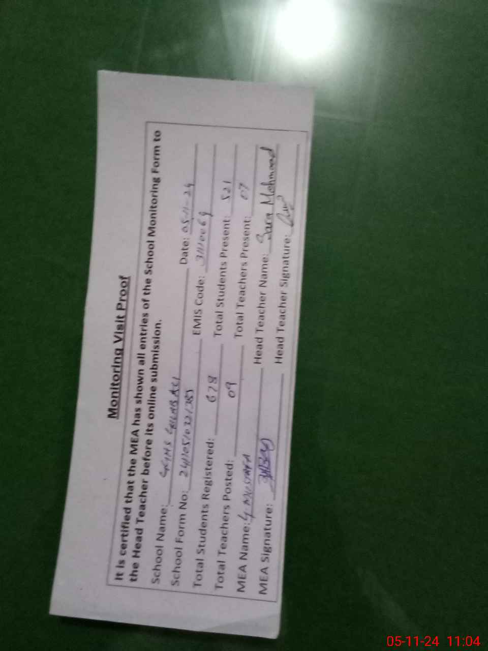 | Attendance Register | Head Teacher | MEA with School | Visit Proof |