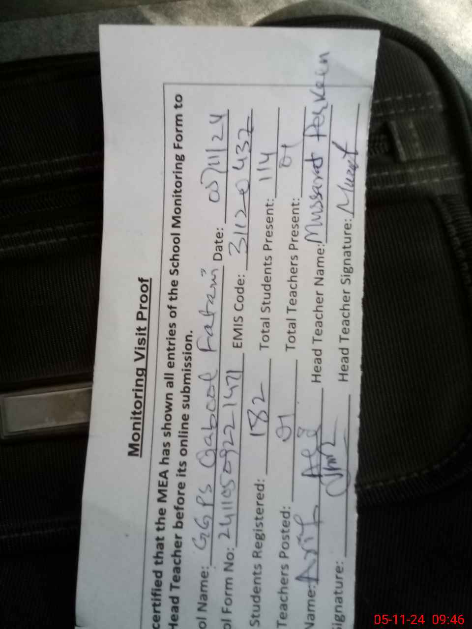 | Attendance Register | Head Teacher | MEA with School | Visit Proof |