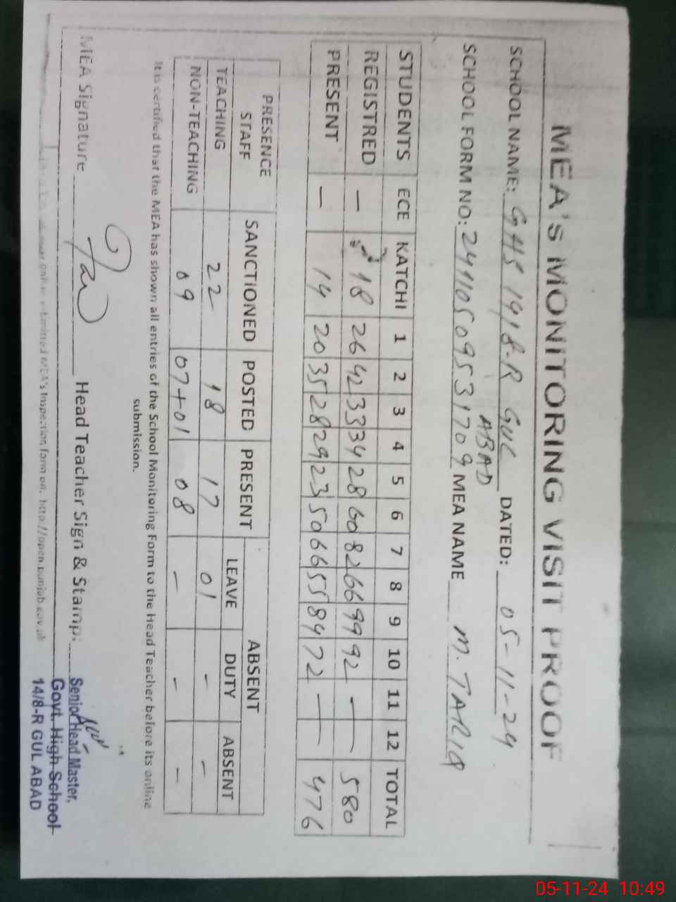 | Attendance Register | Head Teacher | MEA with School | Visit Proof |