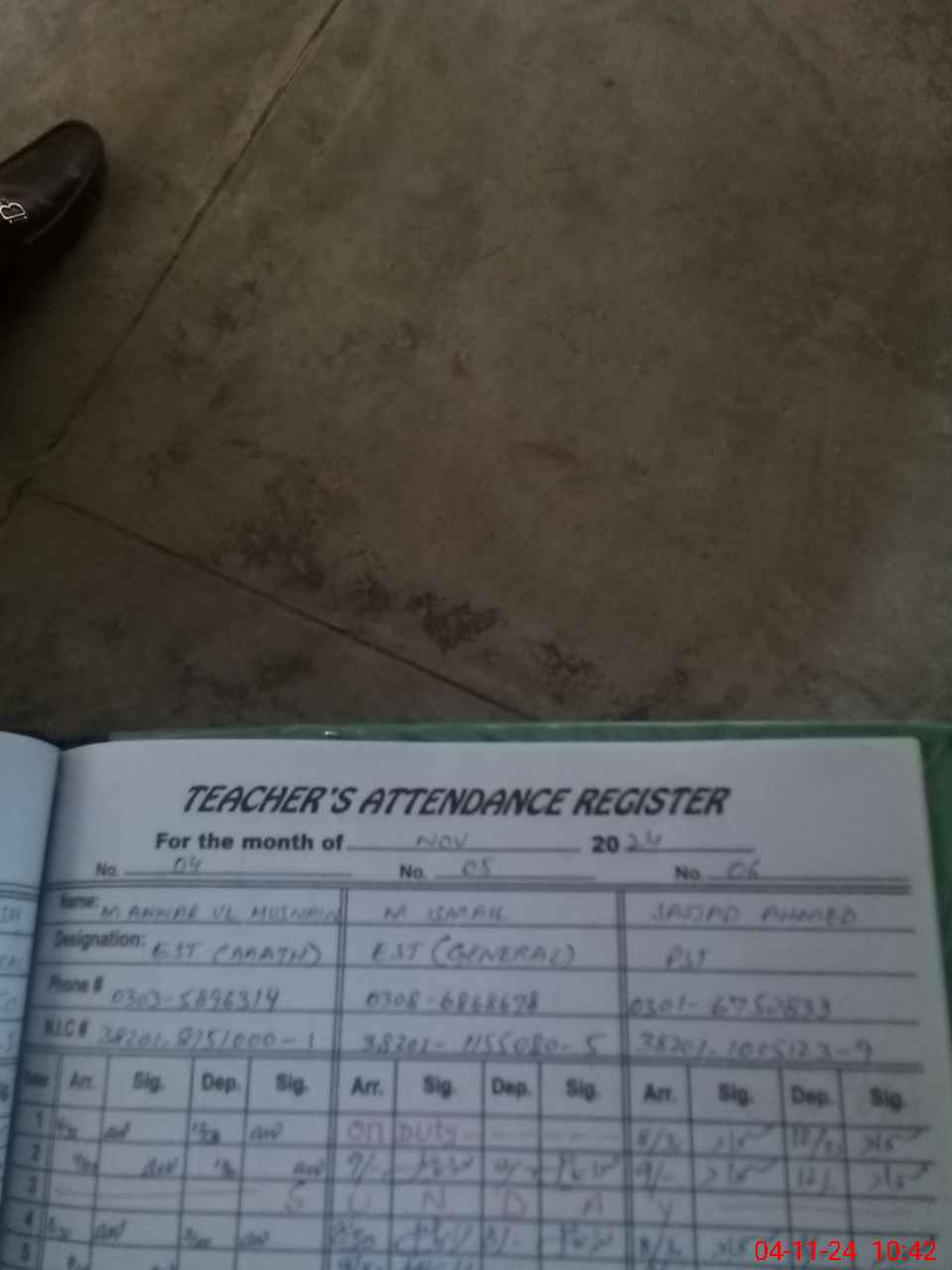 | CNIC | Full Name | Designation | R/C | Absence during last cal. month |