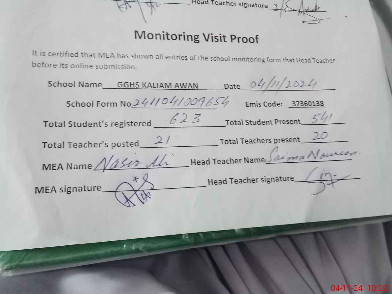 | Attendance Register | Head Teacher | MEA with School | Visit Proof |