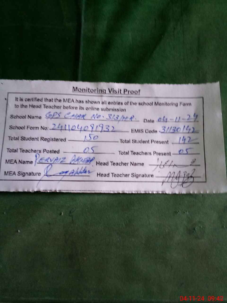 | Attendance Register | Head Teacher | MEA with School | Visit Proof |