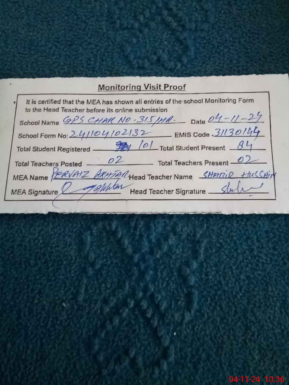 | EMIS Code: 31130144 | Name of School: GPS CHAK 315/HR | |||