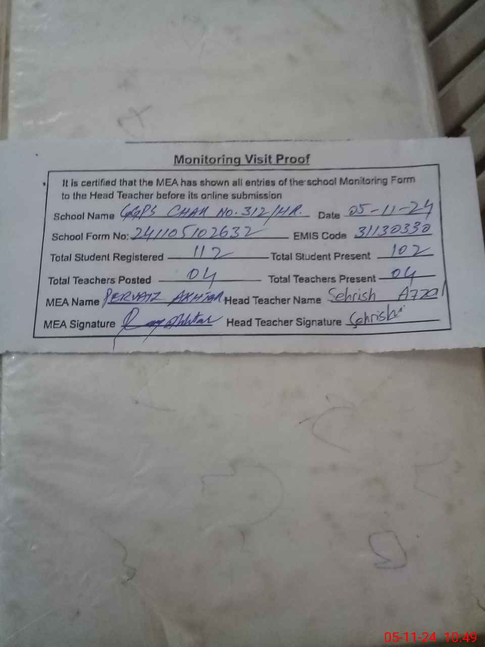 | EMIS Code: 31130330 | Name of School: GGPS CHAK NO. 312 HR | |||