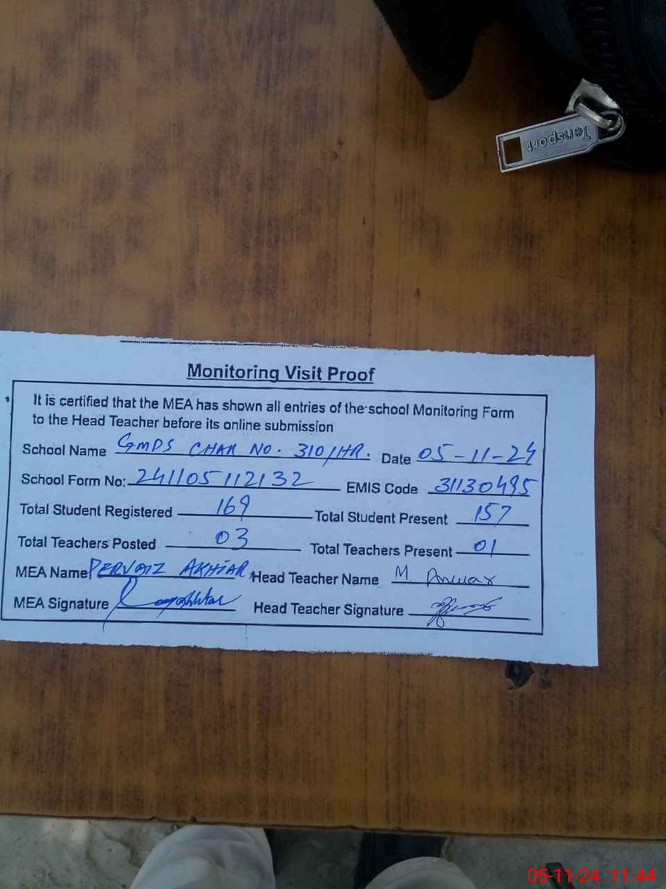 | Attendance Register | Head Teacher | MEA with School | Visit Proof |
