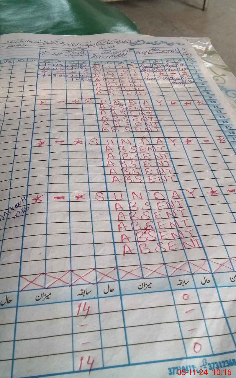 | CNIC | Full Name | Designation | R/C | Absence During Last Calender Month |
