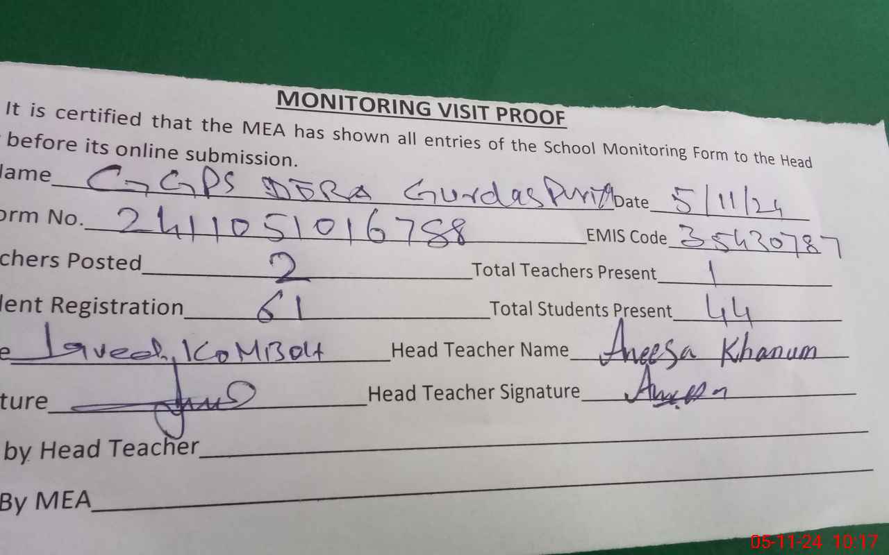 | Attendance Register | Head Teacher | MEA with School | Visit Proof |