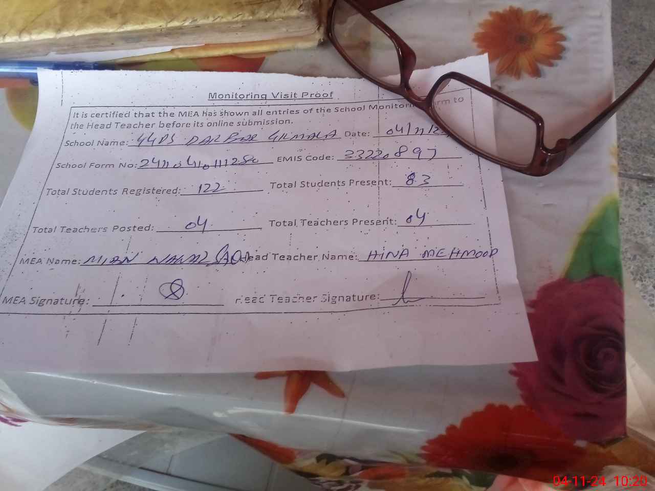 | Attendance Register | Head Teacher | MEA with School | Visit Proof |