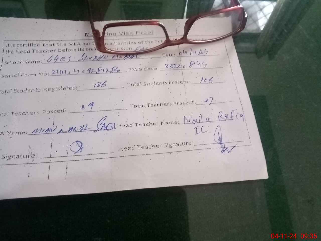 | Attendance Register | Head Teacher | MEA with School | Visit Proof |