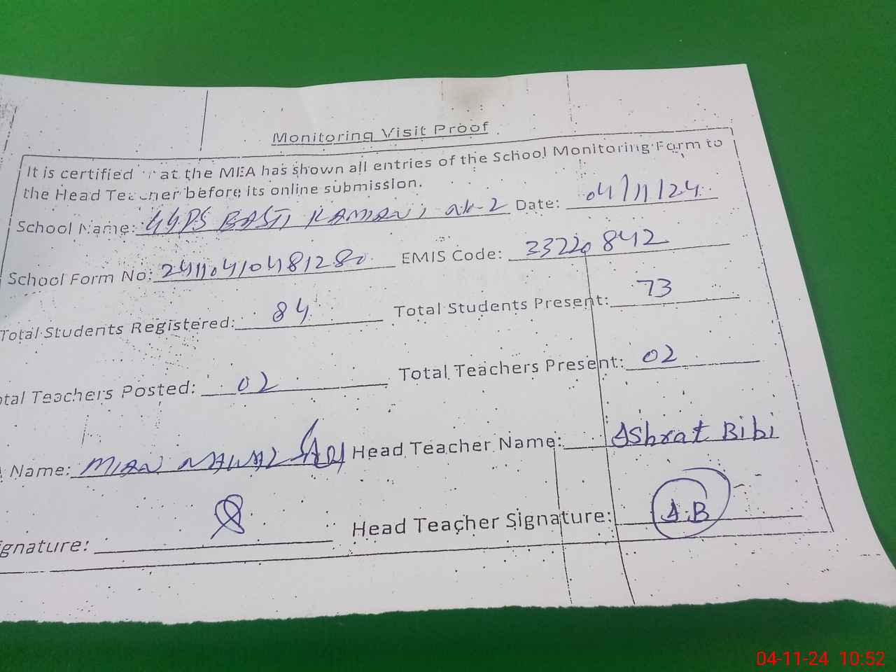 | Monitoring Date: 04-11-2024 | Start Time: 04-11-2024 10:29 AM | End Time: 04-11-2024 10:54 AM | Name of MEA: J-**** MU**** NA**** SA**** | |