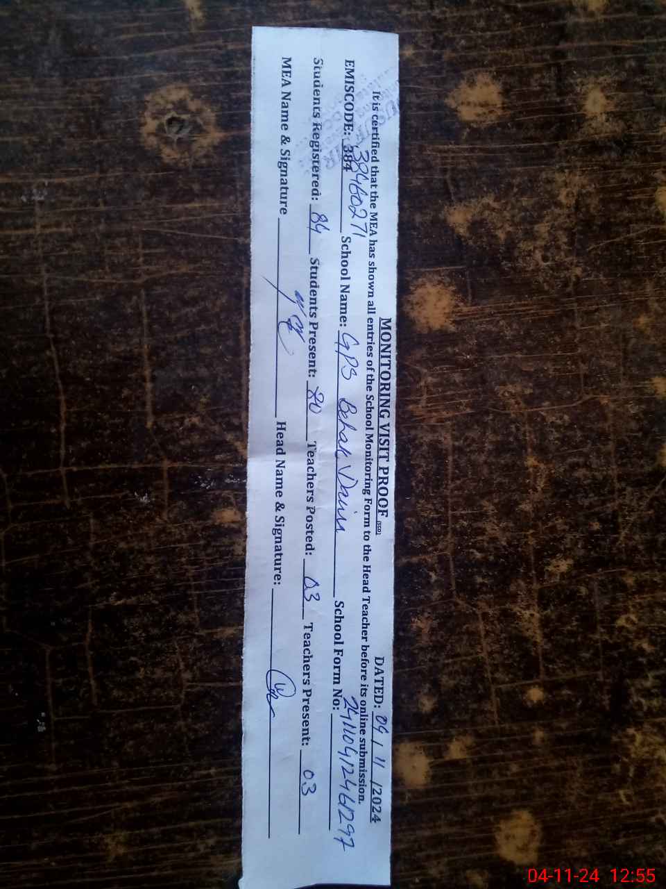 | Attendance Register | Head Teacher | MEA with School | Visit Proof |