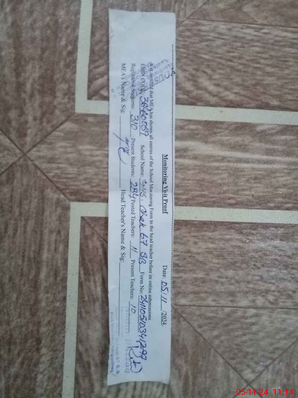 | Attendance Register | Head Teacher | MEA with School | Visit Proof |