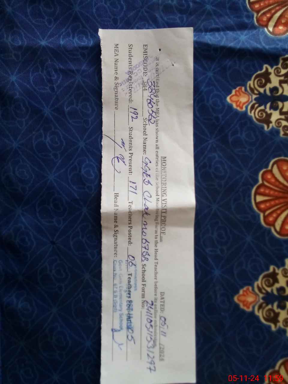 | Name: NU**** FA**** Designation: (School Headmaster's/Headmistress's) EST Phone/Cell Number: 03**** |