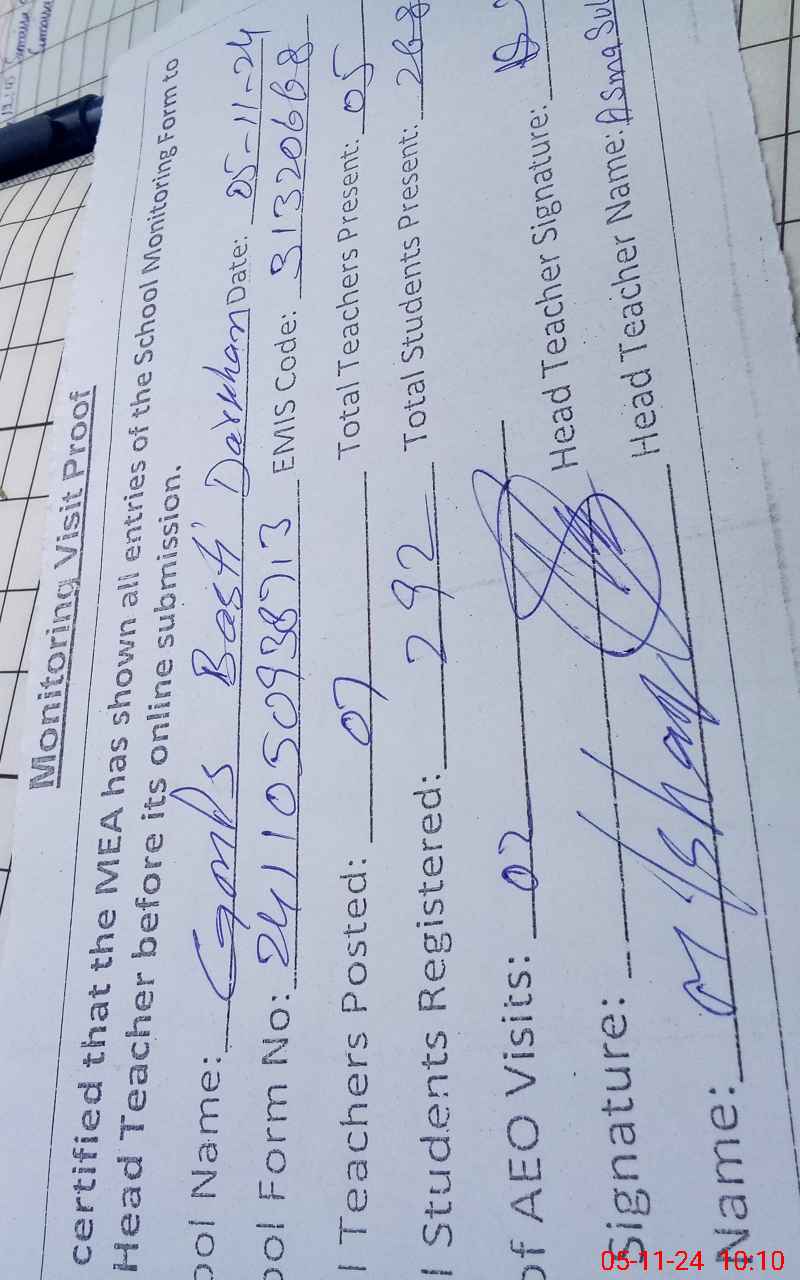 | Name: As**** Su**** Designation: (School Headmaster's/Headmistress's) EST Phone/Cell Number: 03**** |